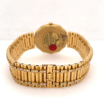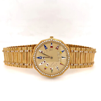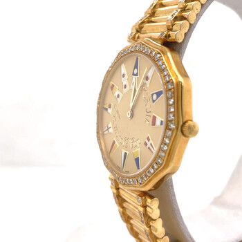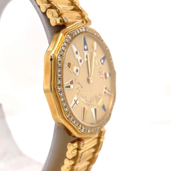 Yellow gold-tone 18kt yellow gold case and bracelet. Fixed yellow gold-tone bezel with diamond set 18kt yellow gold. Champagne dial with yellow gold-tone hands and index hour markers. Dial Type: Analog. Quartz movement. Scratch resistant sapphire crystal. Pull / push crown. Solid case back. Dodecagon case shape, case size: 33 mm, case thickness: 5 mm. Band width: 17 mm. Hidden clasp. Water resistant at 30 meters / 100 feet. Functions: hour, minute. Admirals Cup Series. Luxury watch style. Watch label: Swiss Made. Pre-owned Corum Admirals Cup Quartz Diamond Champagne Dial Unisex Watch 44810.65.V.67.