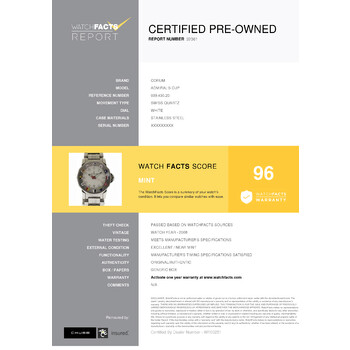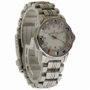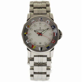 Silver-tone stainless steel case with a silver-tone stainless steel bracelet. Nautical flag silver-tone stainless steel bezel. White dial with index hour markers. Minute markers around the outer rim. Dial Type: Analog. Luminescent hands and markers. Date display at the 6 o'clock position. Corum Calibre CO 039 quartz movement. Scratch resistant sapphire crystal. Solid case back. Dodecagon case shape. Case size: 29 mm. Band length: 6.75 inches. Deployment with push button release clasp. Water resistant at 100 meters / 330 feet. Functions: date, hour, minute, second. Luxury watch style. Watch label: Swiss Made. Pre-owned Corum Admirals Cup White Dial Ladies Watch 039.430.20/V785 AA32.