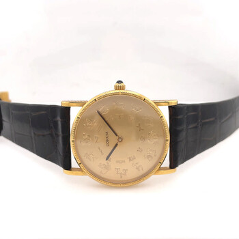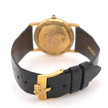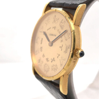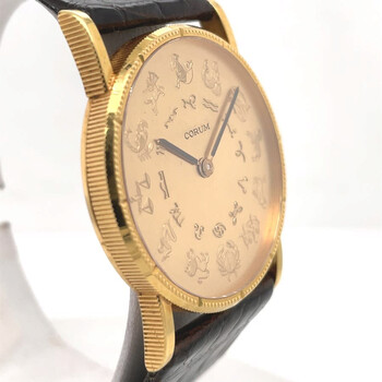 Yellow gold-tone 18kt yellow gold case with a black leather strap. Fixed yellow gold-tone 18kt yellow gold bezel. Yellow dial with black hands. Dial Type: Analog. Hand wind movement. Pull / push crown. Solid case back. Round case shape, case size: 33 mm, case thickness: 5.6 mm. Band width: 21 mm. Buckle clasp. Functions: hour, minute. Astrological Zodic Series. Luxury watch style. Watch label: Swiss Made. Pre-owned Corum Astrological Zodic Hand Wind Unisex Watch 57245.56.