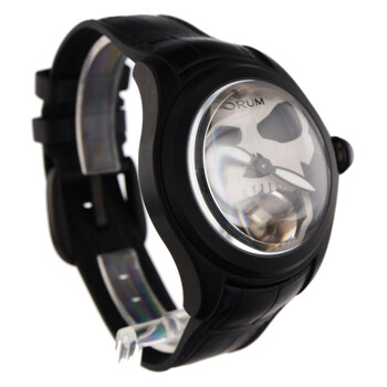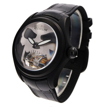 Black polycarbonate case with a black leather strap. Fixed black polycarbonate bezel. Black dial with black hands. Dial Type: Analog. Luminescent hands. Automatic movement. Scratch resistant sapphire crystal. Round case shape, case size: 47 mm. Buckle clasp. Functions: hour, minute, second. Bubble Series. Luxury watch style. Watch label: Swiss Made. Pre-owned Corum Bubble Automatic Black Dial Men's Watch 016.301.98/0001SK01.