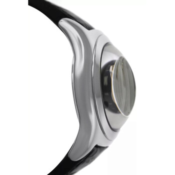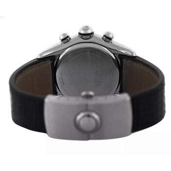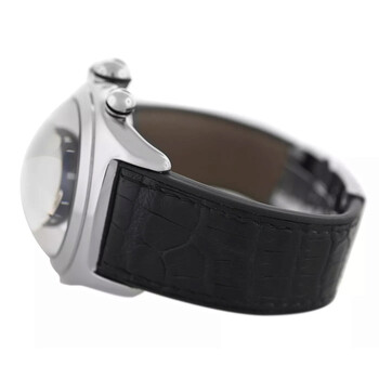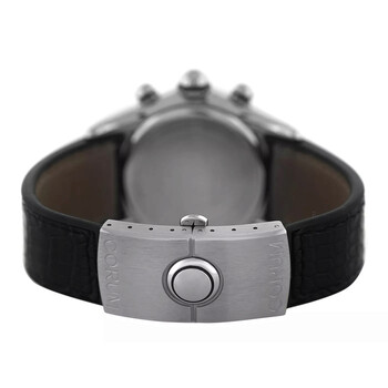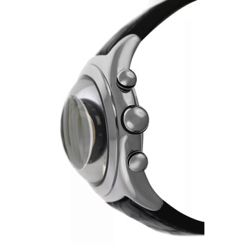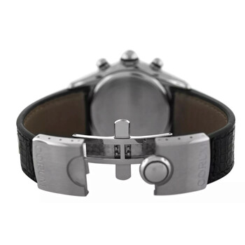 Silver-tone stainless steel case with a black leather strap. Fixed silver-tone stainless steel bezel. Black dial with silver-tone hands and Arabic numeral & index hour markers. Minute markers around the outer rim. Dial Type: Analog. Luminescent hands and markers. Date display at the 6 o'clock position. Quartz movement. Solid case back. Round case shape, case size: 45 mm. Fold over clasp with a safety release. Functions: date, hour, minute, second. Bubble Chrono Series. Luxury watch style. Watch label: Swiss Made. Pre-owned Corum Bubble Chrono Quartz Black Dial Men's Watch 396.150.20.