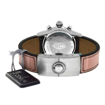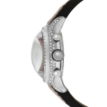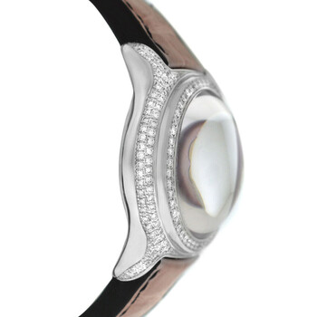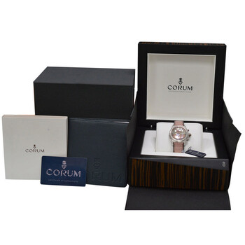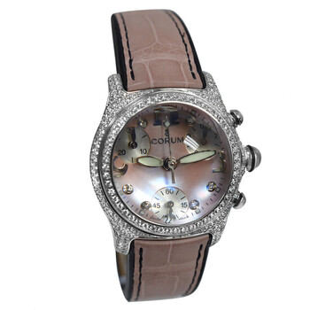 18kt white gold case with a pink leather strap. Fixed bezel with diamond set 18kt white gold. Mother of pearl dial with silver-tone hands and Arabic numeral & index hour markers. Minute markers around the outer rim. Dial Type: Analog. Luminescent hands and markers. Date display at the 6 o'clock position. Quartz movement. Solid case back. Round case shape, case size: 36 mm, case thickness: 17 mm. Deployment with push button release clasp. Water resistant at 50 meters / 165 feet. Functions: chronograph, date, hour, minute, second. Bubble Series. Casual watch style. Watch label: Swiss Made. Pre-owned Corum Bubble Chronograph Quartz Diamond Ladies Watch 196.153.69.