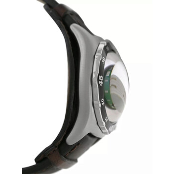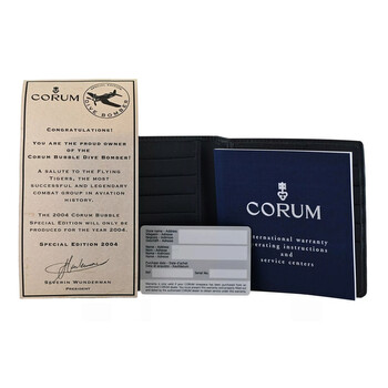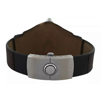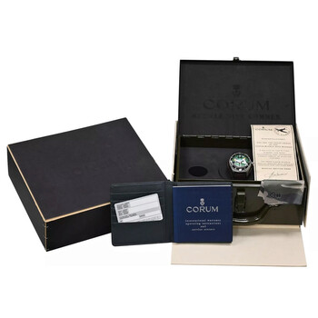 Silver-tone stainless steel case with a rubber strap. Fixed silver-tone stainless steel bezel. Green dial with black hands and Arabic numeral & index hour markers. Dial Type: Analog. Luminescent hands. Date display at the 6 o'clock position. Automatic movement. Scratch resistant sapphire crystal. Round case shape, case size: 44 mm. Deployment with push button release clasp. Functions: date, hour, minute, second. Bubble Dive Bomber Series. Luxury watch style. Watch label: Swiss Made. Pre-owned Corum Bubble Dive Bomber Automatic Green Dial Ladies Watch 82.180.20.
