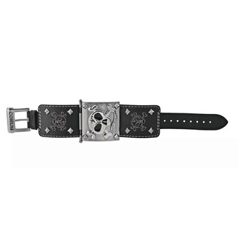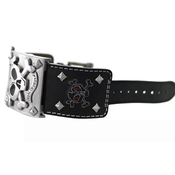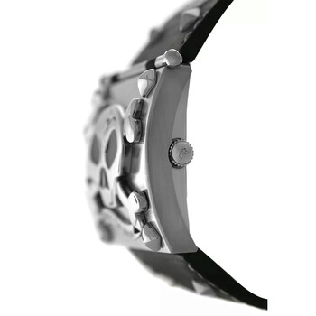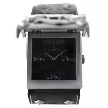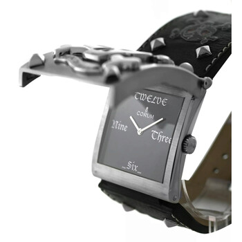 Silver-tone stainless steel case with a black leather strap. Fixed silver-tone stainless steel bezel. Black dial with silver-tone hands. Dial Type: Analog. Quartz movement. Solid case back. Square case shape, case size: 42 mm. Buckle clasp. Functions: hour, minute. Buckingham Skull Series. Casual watch style. Watch label: Swiss Made. Pre-owned Corum Buckingham Skull Quartz Black Dial Men's Watch 138.177.20.