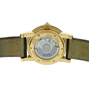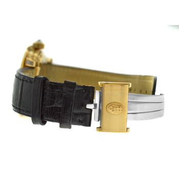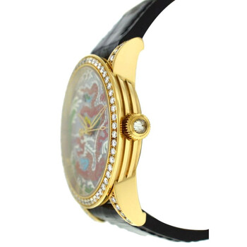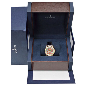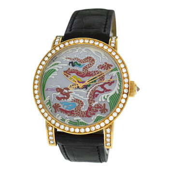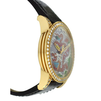 Yellow gold-tone 18kt yellow gold case with a black leather strap. Fixed yellow gold-tone bezel with diamond set 18kt yellow gold. Mother of pearl dial with yellow gold-tone hands and Arabic numeral hour markers. Dial Type: Analog. Automatic movement. Scratch resistant sapphire crystal. Pull / push crown. Transparent see through case back. Round case shape, case size: 42 mm. Tang clasp. Functions: hour, minute, second. Dragon Enamel Series. Casual watch style. Watch label: Swiss Made. Pre-owned Corum Dragon Enamel Automatic Diamond Men's Watch 982.202.65.