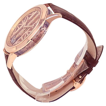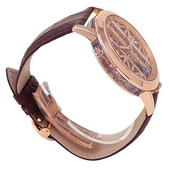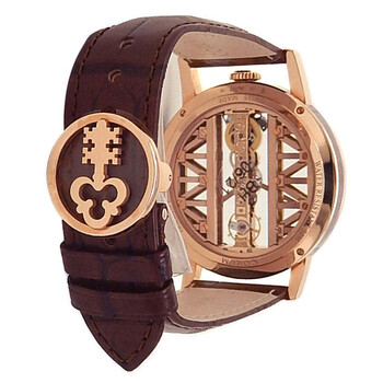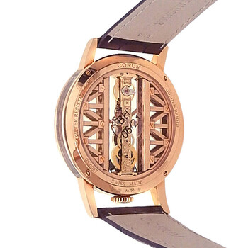 Rose gold-tone 18kt rose gold case with a brown leather strap. Fixed rose gold-tone 18kt rose gold bezel. Gold-tone dial with rose gold-tone hands and index hour markers. Dial Type: Analog. Hand wind movement. Scratch resistant sapphire crystal. Transparent see through case back. Round case shape, case size: 43 mm. Fold over clasp with a safety release. Water resistant at 30 meters / 100 feet. Functions: hour, minute. Golden Bridge Series. Dress watch style. Watch label: Swiss Made. Pre-owned Corum Golden Bridge Hand Wind Gold Dial Men's Watch 113.900.55/0F02 G.