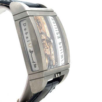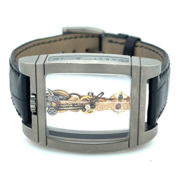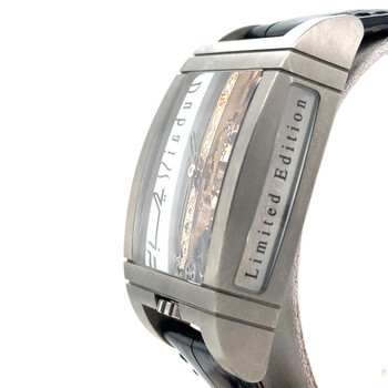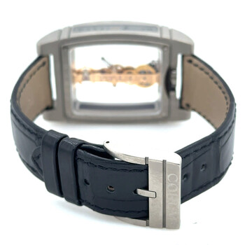 Grey titanium case with a black leather strap. Fixed grey titanium bezel. Transparent dial with black hands. Dial Type: Analog. Hand wind movement. Scratch resistant sapphire crystal. Pull / push crown. Transparent case back. Tonneau case shape, case size: 36 mm, case thickness: 11.5 mm. Band width: 20 mm. Buckle clasp. Water resistant at 10 meters / 33 feet. Functions: hour, minute. Mr. Golden Bridge Series. Luxury watch style. Watch label: Swiss Made. Pre-owned Corum Mr. Golden Bridge Hand Wind Men's Watch 113.700.04/0002.