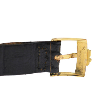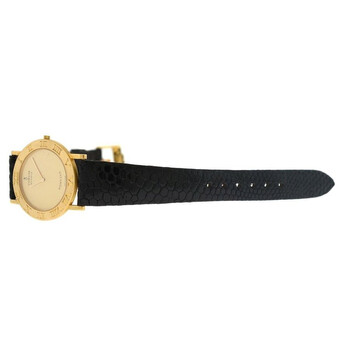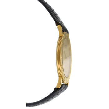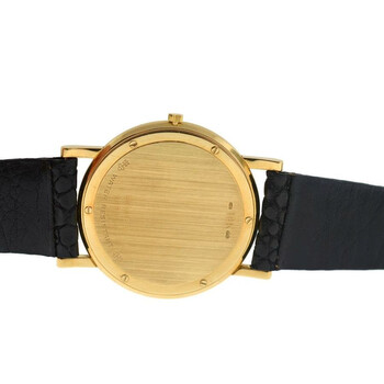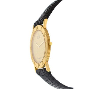 Yellow gold-tone 18kt yellow gold case with a black leather strap. Fixed yellow gold-tone 18kt yellow gold bezel. Gold-tone dial with yellow gold-tone hands and Roman numeral hour markers. Dial Type: Analog. Quartz movement. Pull / push crown. Solid case back. Round case shape, case size: 32 mm. Buckle clasp. Functions: hour, minute. Romvlvs Series. Casual watch style. Watch label: Swiss Made. Pre-owned Corum ROMVLVS Quartz Gold Dial Men's Watch 50.501.56.