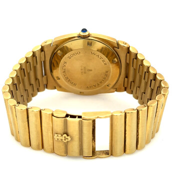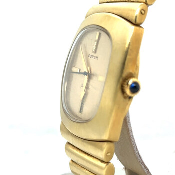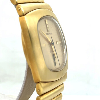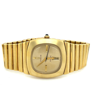 Yellow gold-tone 18kt yellow gold case and bracelet. Fixed yellow gold-tone 18kt yellow gold bezel. Champagne dial with yellow gold-tone hands and index hour markers. Dial Type: Analog. Date display at the 6 o'clock position. Automatic movement. Scratch resistant sapphire crystal. Pull / push crown. Solid case back. Cushion case shape, case size: 36 mm, case thickness: 10 mm. Band width: 22 mm. Fold over clasp. Water resistant at 30 meters / 100 feet. Functions: day, date, hour, minute. Spartacus Series. Luxury watch style. Watch label: Swiss Made. Pre-owned Corum Spartacus Automatic Champagne Dial Men's Watch 90103.