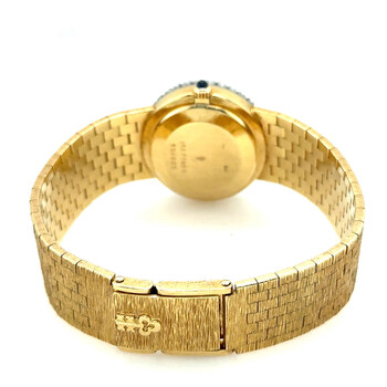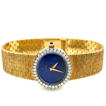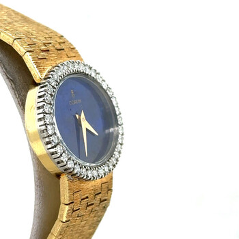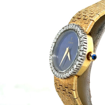 Yellow gold-tone 18kt yellow gold case and bracelet. Fixed yellow gold-tone bezel with diamond set 18kt yellow gold. Blue dial with yellow gold-tone hands. Dial Type: Analog. Hand wind movement. Scratch resistant sapphire crystal. Pull / push crown. Solid case back. Oval case shape, case size: 24 mm, case thickness: 7 mm. Band width: 15 mm. Fold over clasp. Functions: hour, minute. Vintage Series. Luxury watch style. Watch label: Swiss Made. Pre-owned Corum Vintage Hand Wind Diamond Blue Dial Ladies Watch 15677A80.
