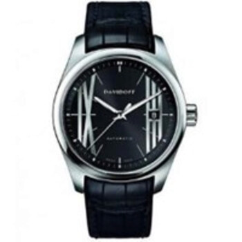 Stainless steel case with a black crocodile leather strap. Fixed silver-tone stainless steel bezel. Black dial with Roman & index hour markers. Dial Type: Analog. Date display at the 3 o'clock position. Automatic movement. Screw down crown. Transparent case back. Round case shape. Case size: 40 mm. Deployment clasp. Water resistant at 30 meters / 100 feet. Functions: date, hour, minute, second. Dress watch style. Watch label: Swiss Made. Pre-owned Davidoff Velocity Date Automatic Black Dial Men's Watch 21131.