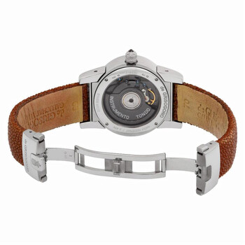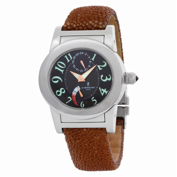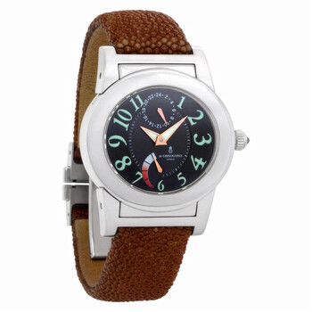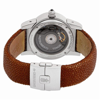 18kt white gold case with a brown leather strap. Fixed 18kt white gold bezel. Black dial with rose gold-tone hands and Arabic numeral hour markers. Minute scale around the inner rim. Dial Type: Analog. Luminescent hands and markers. Automatic movement. Scratch resistant sapphire crystal. Transparent case back. Round case shape, case size: 36 mm. Deployment with push button release clasp. Water resistant at 30 meters / 100 feet. Functions: hour, minute. Instrumento doppio tre series. Luxury watch style. Watch label: Swiss Made. Pre-owned De Grisogono Instrumento Doppio Tre Automatic Black Dial Men's Watch MN01.