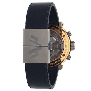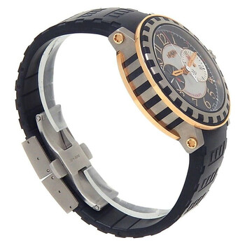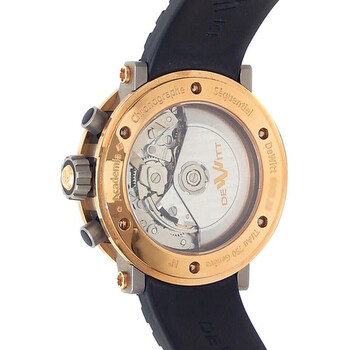 Grey titanium case with a black rubber strap. Fixed grey titanium bezel. Black dial with rose gold-tone hands and Arabic numeral hour markers. Minute markers around the outer rim. Dial Type: Analog. Chronograph - two sub-dials displaying: 60 second and 30 minute. Automatic movement. Scratch resistant sapphire crystal. Transparent see through case back. Round case shape, case size: 43 mm. Deployment with push button release clasp. Functions: chronograph, hour, minute, second. Academia Series. Sport watch style. Watch label: Swiss Made. Pre-owned DeWitt Academia Chronograph Automatic Black Dial Men's Watch AC.6005.53A.M003.