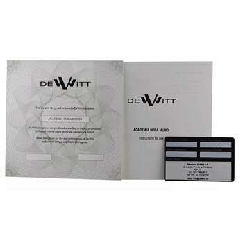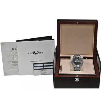 Silver-tone stainless steel case and bracelet. Silver-tone stainless steel bezel. Black dial with silver-tone hands and Arabic numeral & index hour markers. Minute markers around the outer rim. Dial Type: Analog. Date display at the 3 o'clock position. Automatic movement. Scratch resistant sapphire crystal. Solid case back. Round case shape, case size: 43 mm. Fold over clasp with a safety release. Functions: date, hour, minute, second. Academia Hora Mundi Dual Time Date Series. Casual watch style. Watch label: Swiss Made. Pre-owned DeWitt Academia Hora Mundi Dual Time Date Automatic Black Dial Men's Watch NAC.HMI.001-SS.