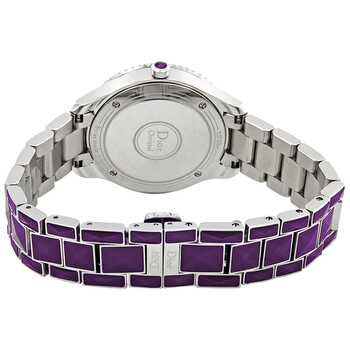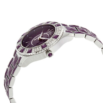 Pre-owned Stainless steel case with a stainless steel bezel set with purple sapphire crystals. Uni-directional rotating stainless steel bezel set with purple sapphire crystals and diamonds. Purple lacquered dial with silver-tone hands and index hour markers. Dial Type: Analog. Quartz movement. Scratch resistant sapphire crystal. Solid case back. Round case shape. Case size: 33 mm. Case thickness: 10.3 mm. Bracelet width: 15 mm. Deployment clasp with a push button release. Water resistant at 50 meters / 165 feet. Functions: hour, minute, second. Luxury watch style. Watch label: Swiss Made. Dior Christal Quartz Diamond Ladies Watch CD143115M001.