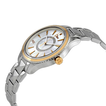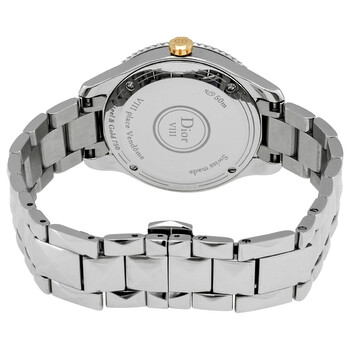 Pre-owned Stainless steel case with a stainless steel bracelet. Fixed stainless steel bezel set with 34 diamonds (0.11ct) bezel. White mother of pearl (diamond-set) dial with silver-tone hands and index hour markers. A Roman numeral appears at the 8 o'clock position. Dial Type: Analog. Quartz movement. Scratch resistant sapphire crystal. Pull / push crown. Solid case back. Round case shape. Case size: 32 mm. Deployment clasp with a push button release. Water resistant at 50 meters / 165 feet. Functions: hour, minute, second. Luxury watch style. Watch label: Swiss Made. Dior Dior VIII Montaigne Ladies Watch CD1521I0M001.