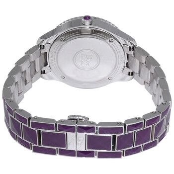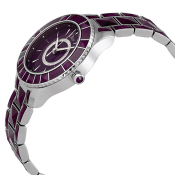 Pre-owned Stainless steel case with a stainless steel bracelet set with purple sapphire crystals. Uni-directional rotating stainless steel bezel set with purple sapphire crystals. Purple dial with luminous silver-tone hands and index hour markers. Dial Type: Analog. Luminescent hands and markers. Quartz movement. Scratch resistant sapphire crystal. Solid case back. Round case shape. Case size: 33 mm. Case thickness: 10.5 mm. Band width: 15 mm, band length: 7 inches. Fold over clasp with a push button release. Water resistant at 50 meters / 165 feet. Functions: hour, minute, second. Luxury watch style. Watch label: Swiss Made. Dior New Christal Purple Diamond Dial Ladies Watch CD143112M001.
