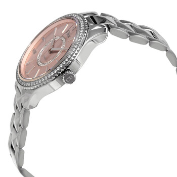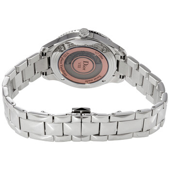 Pre-owned Silver-tone stainless steel case and bracelet. Fixed silver-tone stainless steel set with 67 diamonds bezel. Pink (diamond-set) dial with silver-tone hands and index hour markers. Roman numeral appears at the 8 o'clock position. Dial Type: Analog. Automatic movement. Scratch resistant sapphire crystal. Pull / push crown. Solid case back. Round case shape, case size: 32 mm, case thickness: 10.85 mm. Band width: 15 mm. Deployment clasp. Water resistant at 50 meters / 165 feet. Functions: hour, minute, second. Viii Montaigne Series. Dress watch style. Watch label: Swiss Made. Dior VIII Montaigne Automatic Diamond Ladies Watch CD152510M002.
