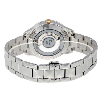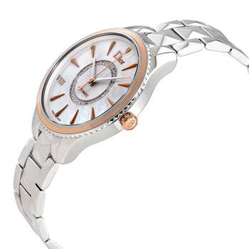 Pre-owned Stainless steel case with a stainless steel bracelet. Fixed rose gold bezel. White mother of pearl diamond-set dial with silver-tone hands and index hour markers. A Roman numeral appears at the 8 o'clock position. Dial Type: Analog. Automatic movement with a 42-hour power reserve. Scratch resistant sapphire crystal. Pull / push crown. Transparent case back. Round case shape. Case size: 36 mm. Band width: 18 mm. Deployment clasp with a push button release. Water resistant at 50 meters / 165 feet. Functions: hour, minute, second. Luxury watch style. Watch label: Swiss Made. Dior VIII Montaigne Automatic Mother of Pearl Dial Ladies Watch CD1535I0M001.