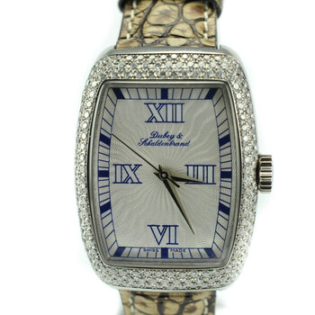 Silver-tone stainless steel case with a brown crocodile leather strap. Fixed silver-tone diamond bezel. Silver-tone dial with black hands and Roman numeral & index hour markers. Minute markers around the outer rim. Dial Type: Analog. Automatic movement. Scratch resistant sapphire crystal. Screw down crown. Solid case back. Rectangle case shape, case size: 26 mm, case thickness: 11 mm. Band width: 15 mm, band length: 6.5 inches. Buckle clasp. Water resistant at 100 meters / 330 feet. Functions: hour, minute, second. Luxury watch style. Watch label: Swiss Made. Pre-owned Dubey Schaldenbrand Lady Diamond Diamond Silver-tone Dial Ladies Watch 516.