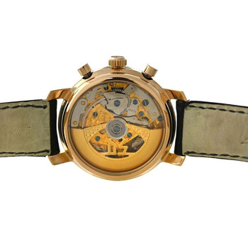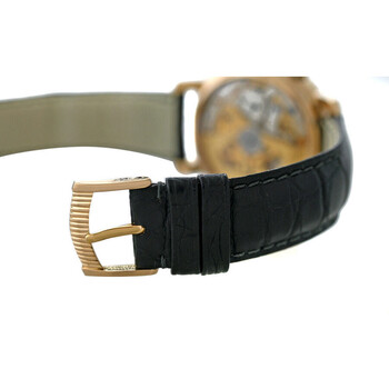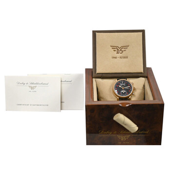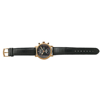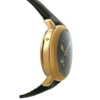 Rose gold-tone 18kt rose gold case with a black leather strap. Fixed rose gold-tone 18kt rose gold bezel. Black dial with rose gold-tone hands and Arabic numeral & index hour markers. Minute markers around the outer rim. Dial Type: Analog. Luminescent hands and markers. Date display around the outer rim. Automatic movement. Transparent see through case back. Round case shape, case size: 38 mm. Band length: 7.75 inches. Buckle clasp. Functions: month, date, day, hour, minute, second. Moondate Series. Luxury watch style. Watch label: Swiss Made. Pre-owned Dubey Schaldenbrand Moondate Automatic Black Dial Men's Watch 00176254316120.