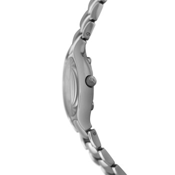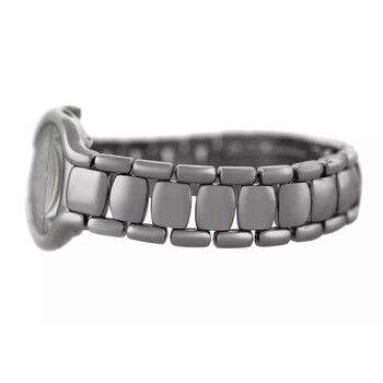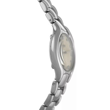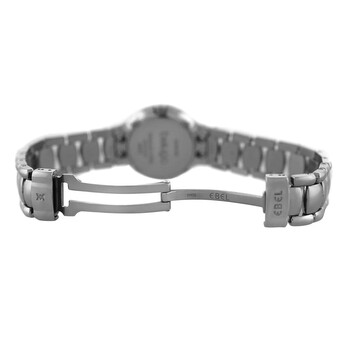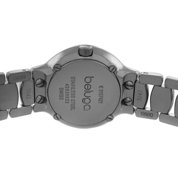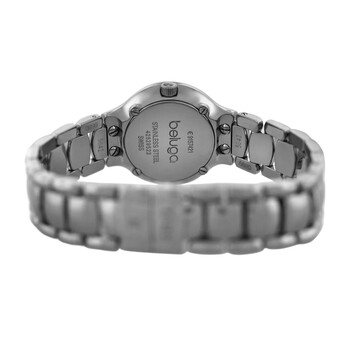 Silver-tone stainless steel case and bracelet. Fixed silver-tone stainless steel bezel. Silver-tone dial with silver-tone hands and diamond hour markers. Dial Type: Analog. Quartz movement. Round case shape, case size: 27 mm. Band length: 6.5 inches. Fold over clasp with a safety release. Functions: hour, minute. Beluga Series. Luxury watch style. Watch label: Swiss Made. Pre-owned Ebel Beluga Quartz Diamond Silver Dial Ladies Watch E9157421.
