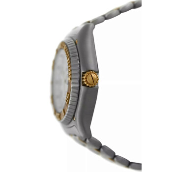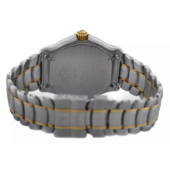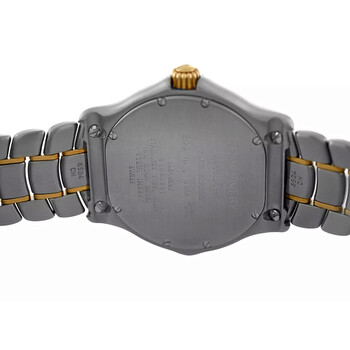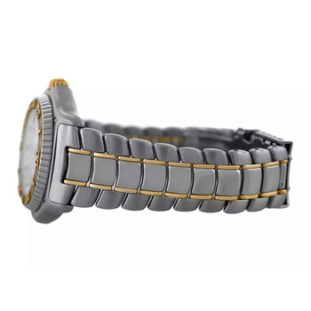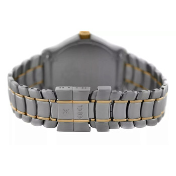 Silver-tone stainless steel case with a two-tone (silver-tone and rose gold-tone) stainless steel bracelet. Rose gold-tone 18kt rose gold bezel. White dial with rose gold-tone hands and Arabic numeral & index hour markers. Minute markers around the outer rim. Dial Type: Analog. Date display at the 3 o'clock position. Automatic movement. Solid case back. Round case shape, case size: 40 mm. Band length: 7.75 inches. Fold over clasp with a safety release. Water resistant at 200 meters / 660 feet. Functions: date, hour, minute, second. Discovery Series. Luxury watch style. Watch label: Swiss Made. Pre-owned Ebel Discovery Automatic White Dial Men's Watch E1080341.