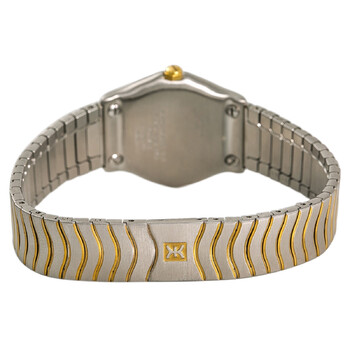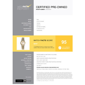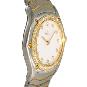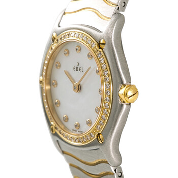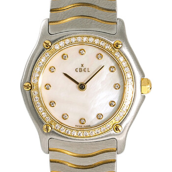 Silver-tone stainless steel case with a two-tone (silver-tone and gold-tone) stainless steel and 18kt yellow gold bracelet. Fixed 18kt yellow gold diamond set bezel. White mother of pearl dial with gold-tone hands and diamond hour markers. Dial Type: Analog. Quartz movement. Scratch resistant sapphire crystal. Pull / push crown. Solid case back. Round case shape, case size: 26 mm, case thickness: 6 mm. Band width: 24 mm, band length: 7 inches. Deployment clasp. Water resistant at 50 meters / 165 feet. Functions: hour, minute. Dress watch style. Watch label: Swiss Made. Pre-owned Ebel Sport Classic Diamond Ladies Watch 1090124.