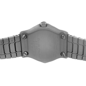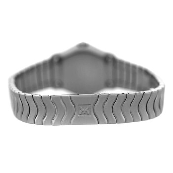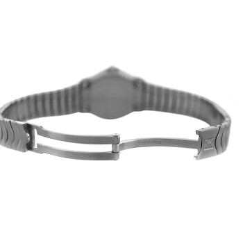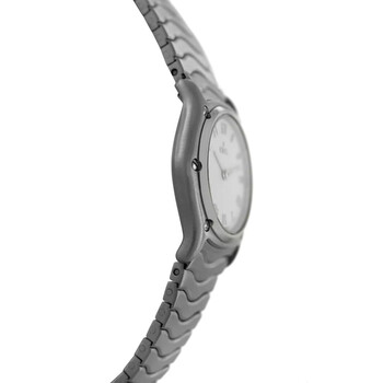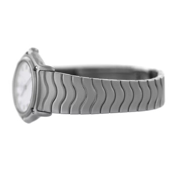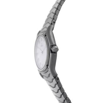 Silver-tone stainless steel case and bracelet. Fixed silver-tone stainless steel bezel. Silver-tone dial with silver-tone hands and Roman numeral hour markers. Dial Type: Analog. Quartz movement. Solid case back. Round case shape, case size: 24 mm. Fold over clasp with a safety release. Functions: hour, minute. Wave Series. Casual watch style. Watch label: Swiss Made. Pre-owned Ebel Wave Quartz Silver Dial Ladies Watch E9157111.