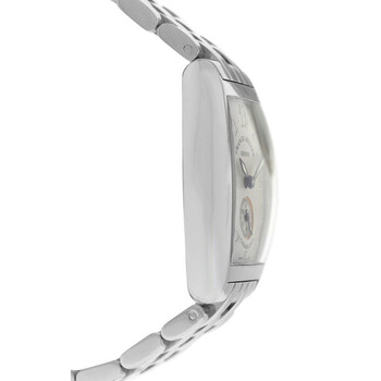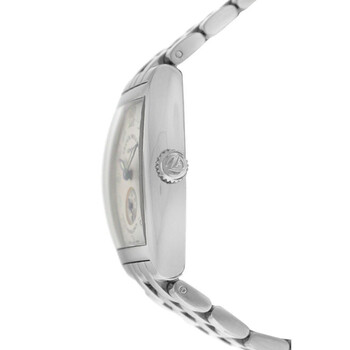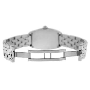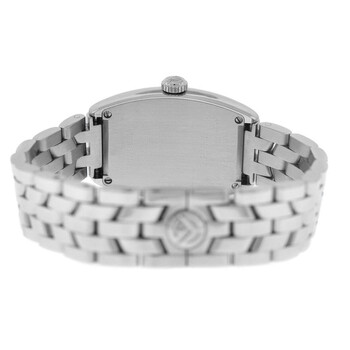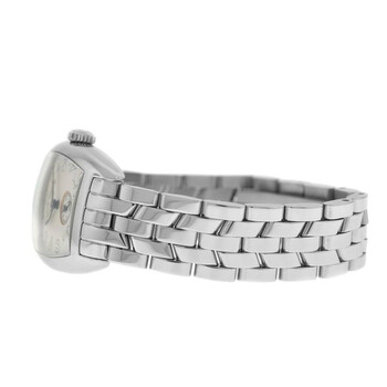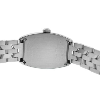 Silver-tone stainless steel case and bracelet. Fixed silver-tone stainless steel bezel. Silver-tone dial with blue hands and Arabic numeral hour markers. Dial Type: Analog. Luminescent hands and markers. Hand wind movement. Solid case back. Tonneau case shape, case size: 28 mm. Fold over clasp with a safety release. Functions: hour, minute, second. Casablanca Series. Casual watch style. Watch label: Swiss Made. Pre-owned Franck Muller Casablanca Hand Wind Silver Dial Ladies Watch 1750S6.