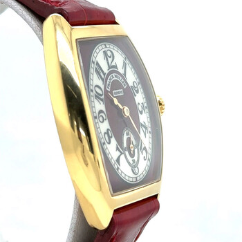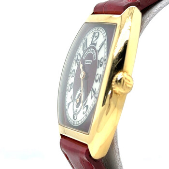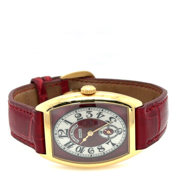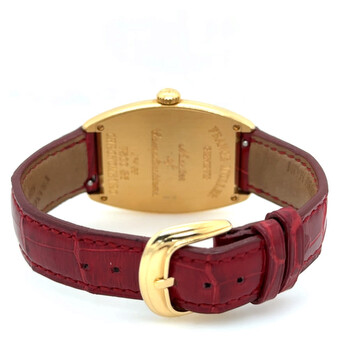 Yellow gold-tone 18kt yellow gold case with a red leather strap. Fixed yellow gold-tone 18kt yellow gold bezel. Red dial with yellow gold-tone hands and Arabic numeral hour markers. Minute markers around the outer rim. Dial Type: Analog. Hand wind movement. Scratch resistant sapphire crystal. Pull / push crown. Solid case back. Tonneau case shape, case size: 31 mm, case thickness: 10 mm. Band width: 15 mm. Buckle clasp. Water resistant at 30 meters / 100 feet. Functions: hour, minute, second. Chronometro Series. Luxury watch style. Watch label: Swiss Made. Pre-owned Franck Muller Chronometro Hand Wind Red Dial Unisex Watch 7500 S6.