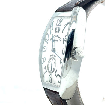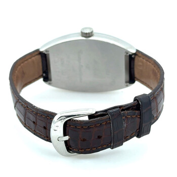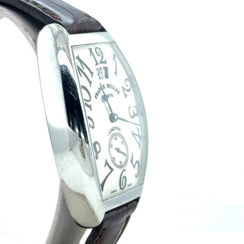 Silver-tone stainless steel case with a brown leather strap. Fixed silver-tone stainless steel bezel. Silver-tone dial with black hands and Arabic numeral hour markers. Dial Type: Analog. Luminescent hands. Date display at the 12 o'clock position. Automatic movement. Scratch resistant sapphire crystal. Pull / push crown. Solid case back. Tonneau case shape, case size: 30 mm, case thickness: 12 mm. Band width: 14 mm. Buckle clasp. Water resistant at 30 meters / 100 feet. Functions: date, hour, minute, second. Cintree Curvex Series. Luxury watch style. Watch label: Swiss Made. Pre-owned Franck Muller Cintree Curvex Automatic Silver Dial Men's Watch 2851 S6.