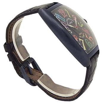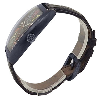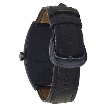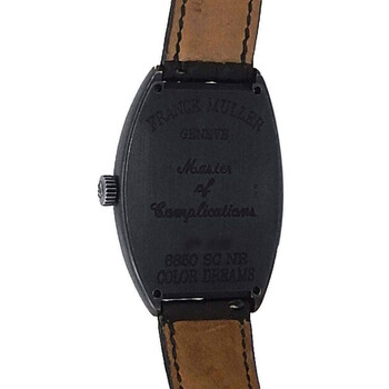 Black stainless steel case with a black leather strap. Fixed black stainless steel bezel. Black dial with silver-tone hands and Arabic numeral hour markers. Dial Type: Analog. Luminescent hands. Automatic movement. Scratch resistant sapphire crystal. Solid case back. Tonneau case shape, case size: 34 mm. Buckle clasp. Functions: hour, minute, second. Color Dreams Series. Casual watch style. Watch label: Swiss Made. Pre-owned Franck Muller Color Dreams Automatic Black Dial Men's Watch 6850 SC NR.