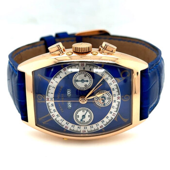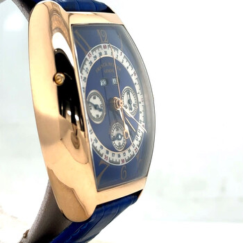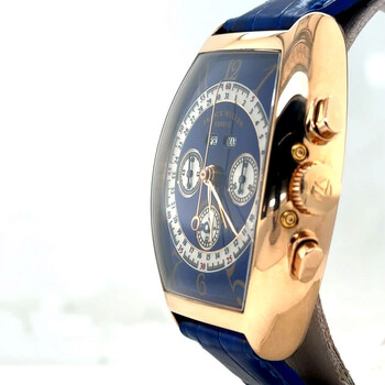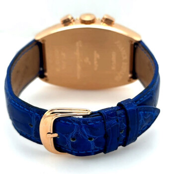 Rose gold-tone 18kt rose gold case with a blue leather strap. Fixed rose gold-tone 18kt rose gold bezel. Blue dial with rose gold-tone hands and Arabic numeral hour markers. Minute markers around the outer rim. Dial Type: Analog. Automatic movement. Scratch resistant sapphire crystal. Pull / push crown. Solid case back. Tonneau case shape, case size: 34 mm, case thickness: 14 mm. Band width: 20 mm. Buckle clasp. Water resistant at 30 meters / 100 feet. Functions: calendar, day, date, month, chronograph, chronometer, hour, minute, second, water resistant. Master Calendar Magnum Series. Luxury watch style. Watch label: Swiss Made. Pre-owned Franck Muller Master Calendar Magnum Chronograph Blue Dial Men's Watch 6850 CC MC.