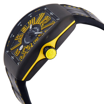 Black titanium case with a black alligator band. Fixed black titanium bezel. Black dial with black hands and Arabic numeral hour markers. Minute markers around the outer rim. Dial Type: Analog. Luminescent hands and markers. Date display at the 6 o'clock position. Automatic movement. Scratch resistant sapphire crystal. Tonneau case shape, case size: 45 mm. Functions: date, hour, minute, second. Vanguard Series. Luxury watch style. Watch label: Swiss Made. Pre-Owned Franck Muller Vanguard Automatic Black Dial Men's Watch V45SCDTTTNRBRJA(NRNRJA).