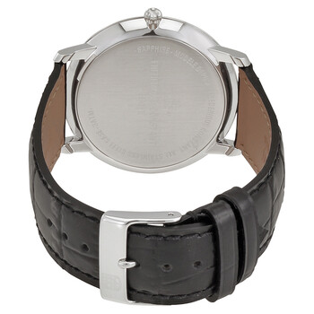 Silver-tone stainless steel case with a black leather strap. Fixed silver-tone stainless steel bezel. Black dial with silver-tone leaf-style shape hands and Roman numeral hour markers. Minute markers around the outer rim. Dial Type: Analog. Date display at the 3 o'clock position. Small seconds subdials. Frederique Constant Calibre FC-245 quartz movement. Scratch resistant sapphire crystal. Solid case back. Round case shape, case size: 40 mm, case thickness: 6 mm. Band width: 20 mm. Tang clasp. Water resistant at 30 meters / 100 feet. Functions: date, hour, minute, second. Dress watch style. Watch label: Swiss Made. Pre-owned Frederique Constant Slimline Quartz Black Dial Men's Watch FC-245BR5S6.