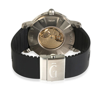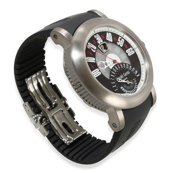 Grey titanium case with a black rubber strap. Fixed grey titanium bezel. Black dial with white hands and Arabic numeral hour markers. Minute markers around the outer rim. Dial Type: Analog. Date display at the 12 o'clock position. Automatic movement. Scratch resistant sapphire crystal. Transparent see through case back. Round case shape, case size: 44 mm, case thickness: 13.00 mm. Band width: 21 mm, band length: 7.25 inches. Fold over clasp with a safety release. Functions: date, hour, minute, second. Additional Info: includes box, service papers, papers, instructions. Arena Series. Sport watch style. Watch label: Swiss Made. Pre-owned Gerald Genta Arena Automatic Black Dial Men's Watch BSP.Y.80.263.CA.BD.