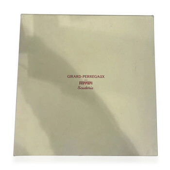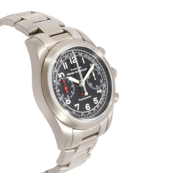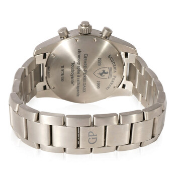 Grey titanium case and bracelet. Fixed grey titanium bezel. Black dial with silver-tone hands and Arabic numeral hour markers. Minute markers around the outer rim. Dial Type: Analog. Luminescent hands and markers. Hand wind movement. Scratch resistant sapphire crystal. Solid case back. Round case shape, case size: 40 mm, case thickness: 14 mm. Band width: 21 mm, band length: 7.75 inches. Hidden clasp. Functions: chronograph, hour, minute, second. Ferrari Series. Sport watch style. Watch label: Swiss Made. Pre-owned Girard Perregaux Ferrari Chronograph Hand Wind Black Dial Unisex Watch 9020.