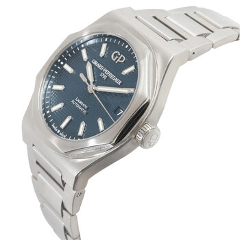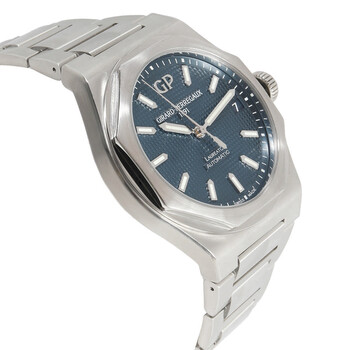 Silver-tone stainless steel case and bracelet. Fixed silver-tone stainless steel bezel. Blue dial with silver-tone hands and index hour markers. Minute markers around the outer rim. Dial Type: Analog. Luminescent hands and markers. Date display at the 3 o'clock position. Girard Perregaux Calibre GP01800-0008 Automatic movement, containing 28 Jewels, bitting at 21600 vph, and has a power reserve of approximately 54 hours. Scratch resistant sapphire crystal. Pull / push crown. Transparent see through case back. Round case shape, case size: 42 mm, case thickness: 10.80 mm. Band width: 25 mm, band length: 7.75 inches. Fold over clasp with a safety release. Water resistant at 100 meters / 330 feet. Functions: date, hour, minute, second. Additional Info: includes box, papers, instructions. Laureto Series. Sport watch style. Watch label: Swiss Made. Pre-owned Girard Perregaux Laureto Automatic Blue Dial Men's Watch 81010-11-431-11A.
