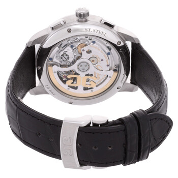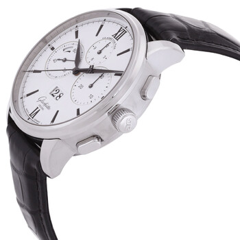 Stainless steel case with a brown (calfskin) leather strap. Fixed stainless steel bezel. Varnish matt white dial with black hands and index hour markers. Roman numerals appear at the 6 and 12 o'clock positions. Arabic numeral minute markers (at 5 minute intervals). Minute markers around the outer rim. Dial Type: Analog. Luminescent hands and markers. Date display above the 6 o'clock position. Chronograph - three sub-dials displaying: 60 second, 30 minute and 12 hour. Glashuette calibre 37-01 automatic movement with a 70-hour power reserve. Scratch resistant sapphire crystal. Screw down crown. Transparent case back. Round case shape. Case size: 42 mm. Case thickness: 14.6 mm. Band width: 21 mm. Fold fastener clasp. Water resistant at 100 meters / 330 feet. Functions: chronograph, date, hour, minute, second, power reserve. Senator Series. Luxury watch style. Watch label: Made in Germany. Glashuette Senator Automatic Chronograph Men's Watch 1-37-01-05-02-35.