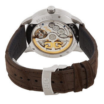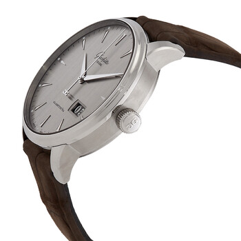 Silver-tone stainless steel case with a brown alligator/crocodile leather strap. Fixed silver-tone stainless steel bezel. Silver dial with silver-tone hands and index hour markers. Dial Type: Analog. Date display between 4 and 5 o'clock position. Glashutte Calibre 36-03 Automatic movement, based upon 36-01, containing 41 Jewels, bitting at 28800 vph, and has a power reserve of approximately 100 hours. Scratch resistant sapphire crystal. Pull / push crown. Transparent case back. Round case shape, case size: 42 mm, case thickness: 12.20 mm. Deployant buckle clasp. Water resistant at 50 meters / 150 feet. Functions: big date, hour, minute, second. Senator Excellence Panorama Date Series. Luxury watch style. Watch label: Made In Germany. Glashutte Original Senator Excellence Panorama Date Automatic Silver Dial Men's Watch 1-36-03-03-02-31.