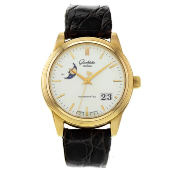 Rose gold-tone 18kt rose gold case with a black leather strap. Fixed rose gold-tone 18kt rose gold bezel. White dial with rose gold-tone hands and index hour markers. Minute markers around the outer rim. Dial Type: Analog. Date display between 4 and 5 o'clock position. Automatic movement. Scratch resistant sapphire crystal. Transparent see through case back. Round case shape, case size: 39 mm. Buckle clasp. Functions: date, hour, minute, second. Senator Panorama Date Series. Luxury watch style. Watch label: Swiss in Germany. Pre-owned Glashutte Original Senator Panorama Date Automatic White Dial Men's Watch 39-41-03-11-04.