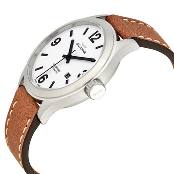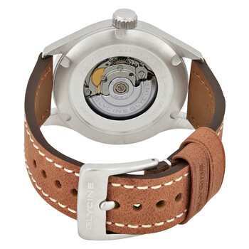 Stainless steel case with a brown leather strap. Fixed stainless steel bezel. Silver dial with black hands and index hour markers. Arabic numerals mark the 3, 6, 9 and 12 o'clock positions. Dial Type: Analog. Date display at the 4 o'clock position. Glycine calibre GL224 automatic movement with a 38-hour power reserve. Scratch resistant sapphire crystal. Transparent case back. Case size: 44 mm. Case thickness: 10.4 mm. Round case shape. Band width: 20 mm. Tang clasp. Water resistant at 100 meters / 330 feet. Functions: date, hour, minute, second. Casual watch style. Watch label: Swiss Made. Glycine Incursore Automatic Silver Dial Men's Watch GL0044.