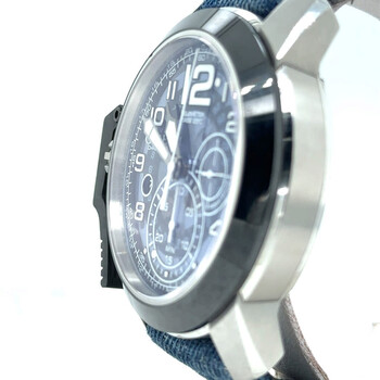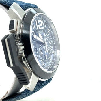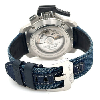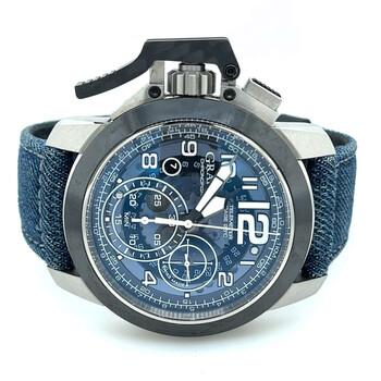 Silver-tone stainless steel case with a blue canvas strap. Fixed black ceramic bezel. Blue dial with silver-tone hands and Arabic numeral hour markers. Minute markers around the outer rim. Dial Type: Analog. Luminescent hands and markers. Automatic movement. Scratch resistant sapphire crystal. Screw down crown. Transparent case back. Round case shape, case size: 47 mm. Band width: 24 mm. Buckle clasp. Water resistant at 100 meters / 330 feet. Functions: date, chronograph, hour, minute, second. Chronofighter Oversized Series. Luxury watch style. Watch label: Swiss Made. Pre-owned Graham Chronofighter Oversized Chronograph Automatic Blue Dial Men's Watch 2CCAC.U04A.T33B.