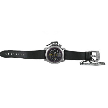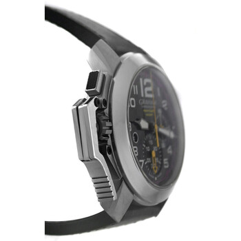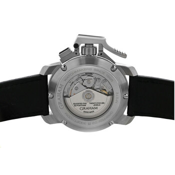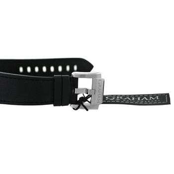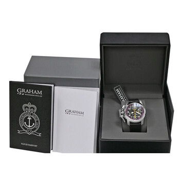 Silver-tone stainless steel case with a black leather strap. Fixed silver-tone stainless steel bezel. Black dial with black hands and Arabic numeral & index hour markers. Minute markers around the outer rim. Dial Type: Analog. Luminescent hands and markers. Automatic movement. Transparent see through case back. Round case shape, case size: 46 mm. Band length: 8.25 inches. Buckle clasp. Water resistant at 100 meters / 330 feet. Functions: chronograph, date, hour, minute, second. Chronofighter Superlight Carbon Series. Luxury watch style. Watch label: Swiss Made. Pre-owned Graham Chronofighter Superlight Carbon Chronograph Automatic Black Dial Men's Watch 2CCAS.V01A.