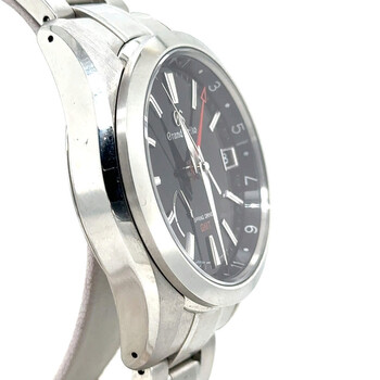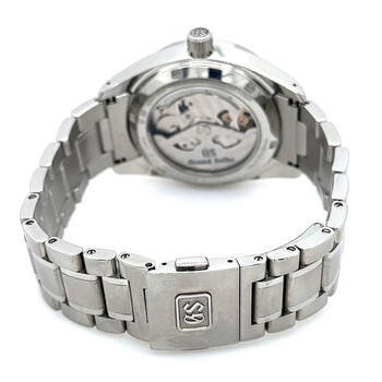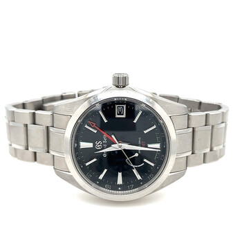 Silver-tone stainless steel case and bracelet. Fixed silver-tone stainless steel bezel. Black dial with silver-tone hands and index hour markers. Minute markers around the outer rim. Dial Type: Analog. Luminescent hands and markers. Date display at the 3 o'clock position. Grand Seiko Calibre 9R66 automatic movement with a 72-hour power reserve. Scratch resistant sapphire crystal. Screw down crown. Transparent case back. Round case shape, case size: 41 mm, case thickness: 15 mm. Band width: 20 mm. Deployment with push button release clasp. Water resistant at 30 meters / 100 feet. Functions: power reserve, date, hour, minute, second, GMT. Heritage Series. Luxury watch style. Pre-owned Grand Seiko Heritage Automatic Black Dial Men's Watch SBGE211.