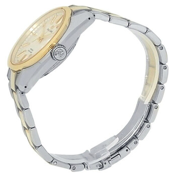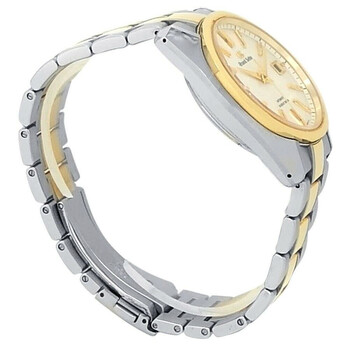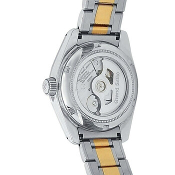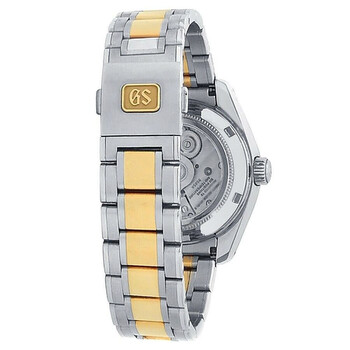 Silver-tone stainless steel case with a two-tone (silver-tone and yellow gold-tone) 18kt yellow gold and stainless steel bracelet. Fixed yellow gold-tone 18kt yellow gold bezel. White dial with yellow gold-tone hands and index hour markers. Minute markers around the outer rim. Dial Type: Analog. Date display at the 3 o'clock position. Automatic movement. Transparent see through case back. Round case shape, case size: 40 mm. Deployment with push button release clasp. Water resistant at 100 meters / 330 feet. Functions: date, hour, minute, second. Heritage Series. Casual watch style. Watch label: Japan Movt. Pre-owned Grand Seiko Heritage Automatic White Dial Men's Watch SBGH252.