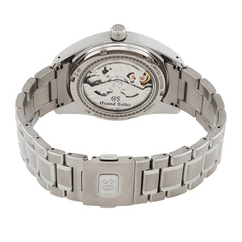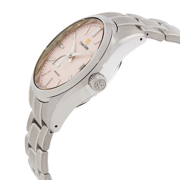 Pre-owned Silver-tone high- intensity titanium case and bracelet. Fixed silver-tone high- intensity titanium bezel. Candy pink dial with silver-tone hands and index hour markers. Minute scale around the inner rim. Dial Type: Analog. Date display at the 3 o'clock position. Grand Seiko Calibre 9R65 automatic movement with a 72-hour power reserve. Scratch resistant sapphire crystal. Screw down crown. Transparent see through case back. Round case shape, case size: 41 mm, case thickness: 12.5 mm. Band width: 20 mm. Three-fold with push button release clasp. Water resistant at 100 meters / 330 feet. Functions: date, hour, minute, second,power reserve indicator. Heritage Series. Dress watch style. Watch label: Swiss Made. Item Variations: SBGA497. Grand Seiko Heritage Automatic Men's Watch SBGA497G.