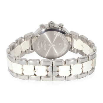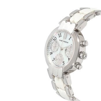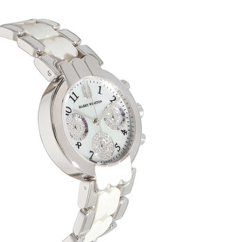 18kt white gold case and bracelet. Fixed 18kt white gold bezel. White dial with silver-tone hands and Arabic numeral hour markers. Dial Type: Analog. Chronograph - three sub-dials displaying: 60 second, 30 minute and 12 hour. Quartz movement. Scratch resistant sapphire crystal. Solid case back. Round case shape, case size: 32 mm, case thickness: 9.70 mm. Band width: 18 mm, band length: 6.25 inches. Fold over clasp with a safety release. Functions: chronograph, hour, minute, second. Additional Info: includes service papers. Premier Series. Sport watch style. Watch label: Swiss Made. Pre-owned Harry Winston Premier Chronograph Quartz White Dial Ladies Watch 200UCQ32W.