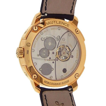 Rose gold-tone 18kt rose gold case with a black canvas strap. Fixed rose gold-tone 18kt rose gold bezel. Brown dial with rose gold-tone hands and Arabic numeral hour markers. Dial Type: Analog. Hand wind movement. Scratch resistant sapphire crystal. Screw down crown. Transparent see through case back. Round case shape, case size: 41 mm. Buckle clasp. Functions: chronograph, hour, minute, second. Hlc-06 Series. Dress watch style. Watch label: Swiss Made. Pre-owned Hautlence HLC-06 Chronograph Hand Wind Brown Dial Men's Watch HLQ-06-01/88. Box: No ,Paper: No